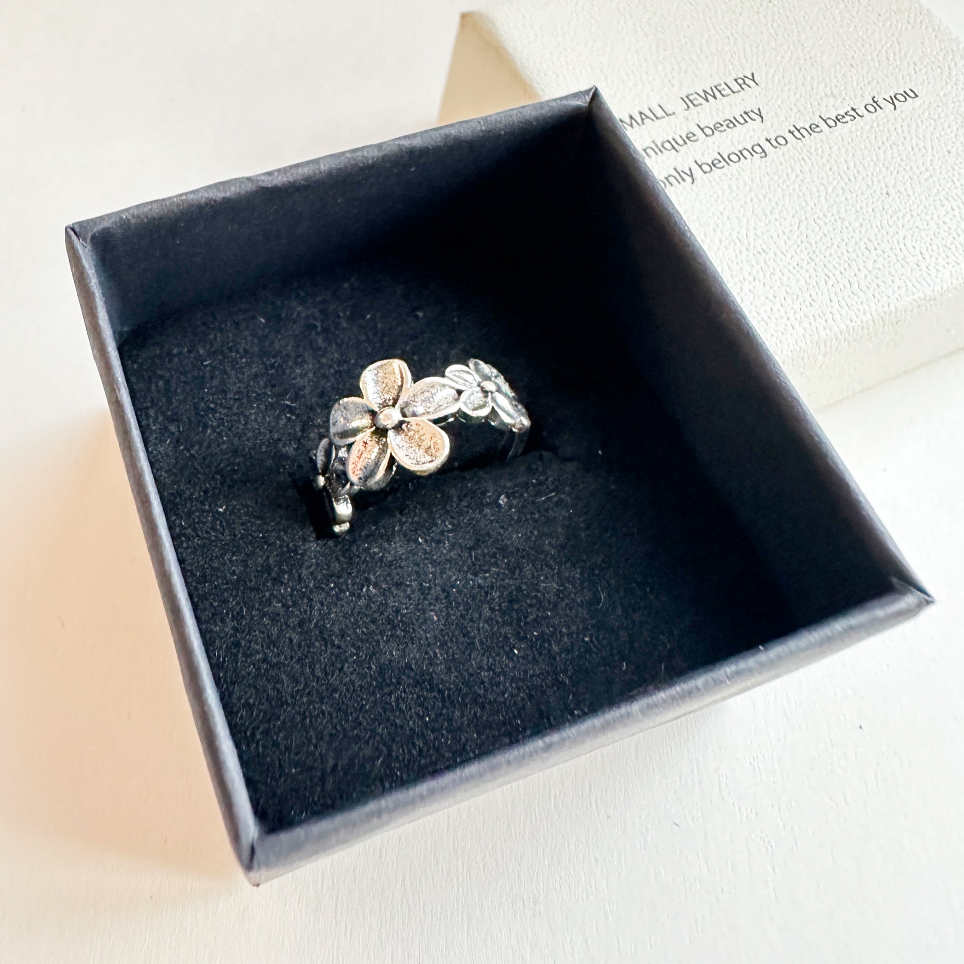 花のデザインのアンティーク調リングです。 ステンレスでお肌に優しく変色しにくい素材です。
