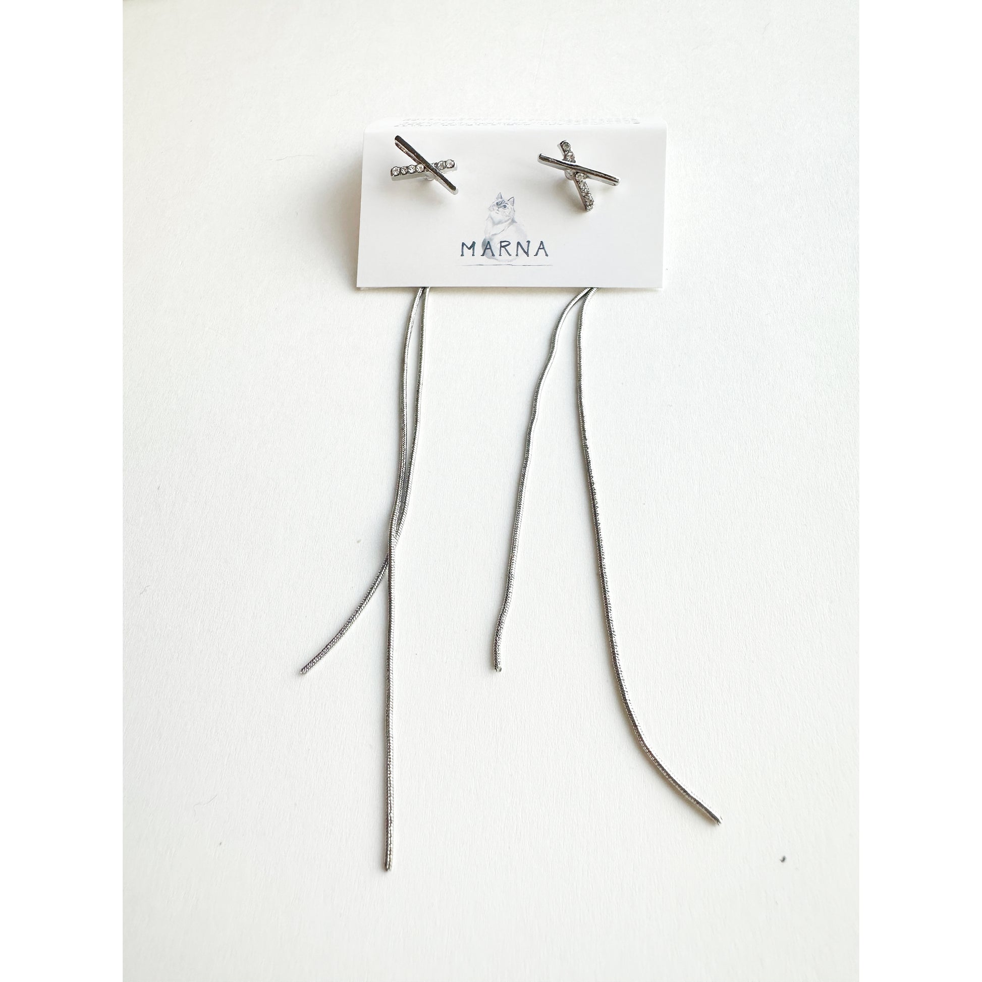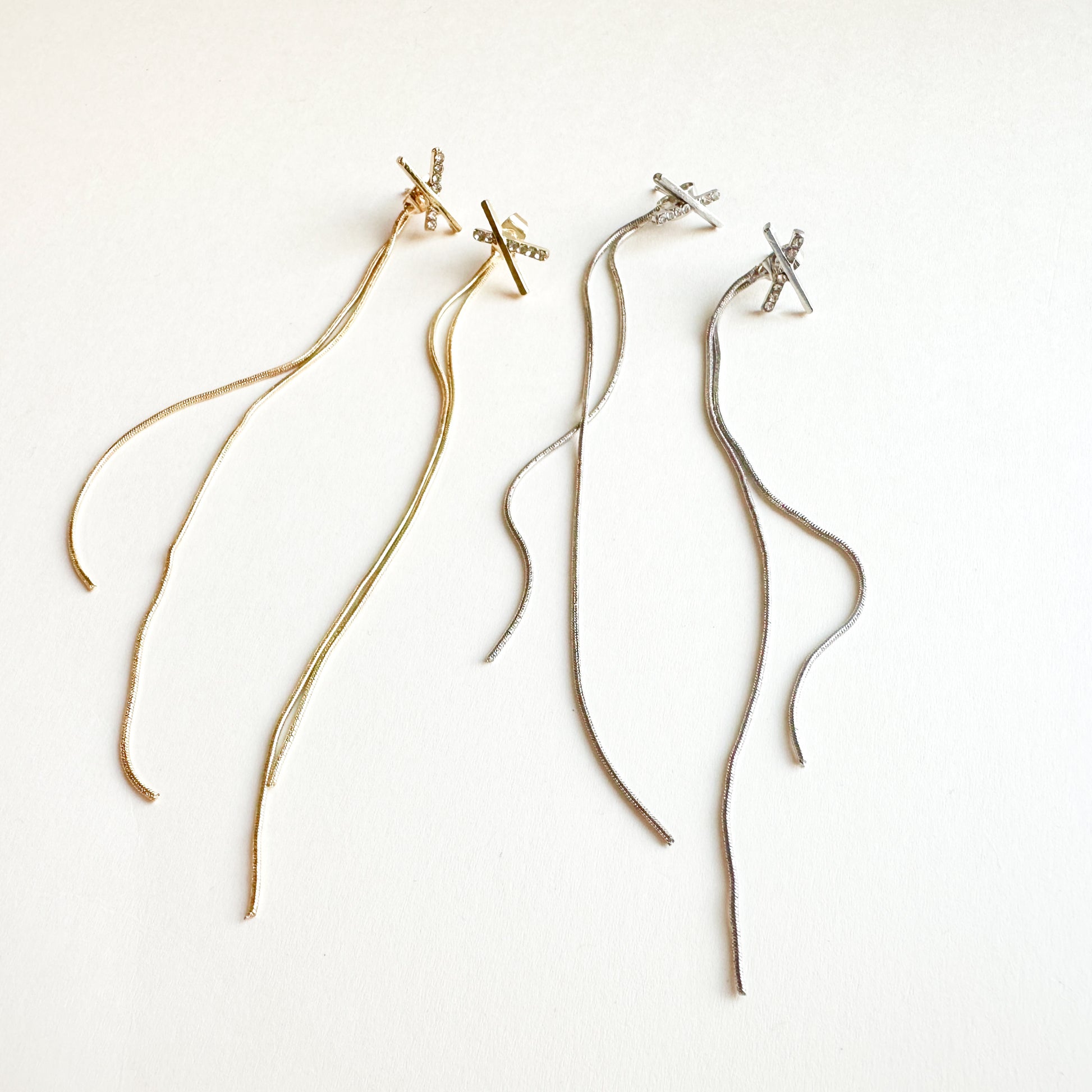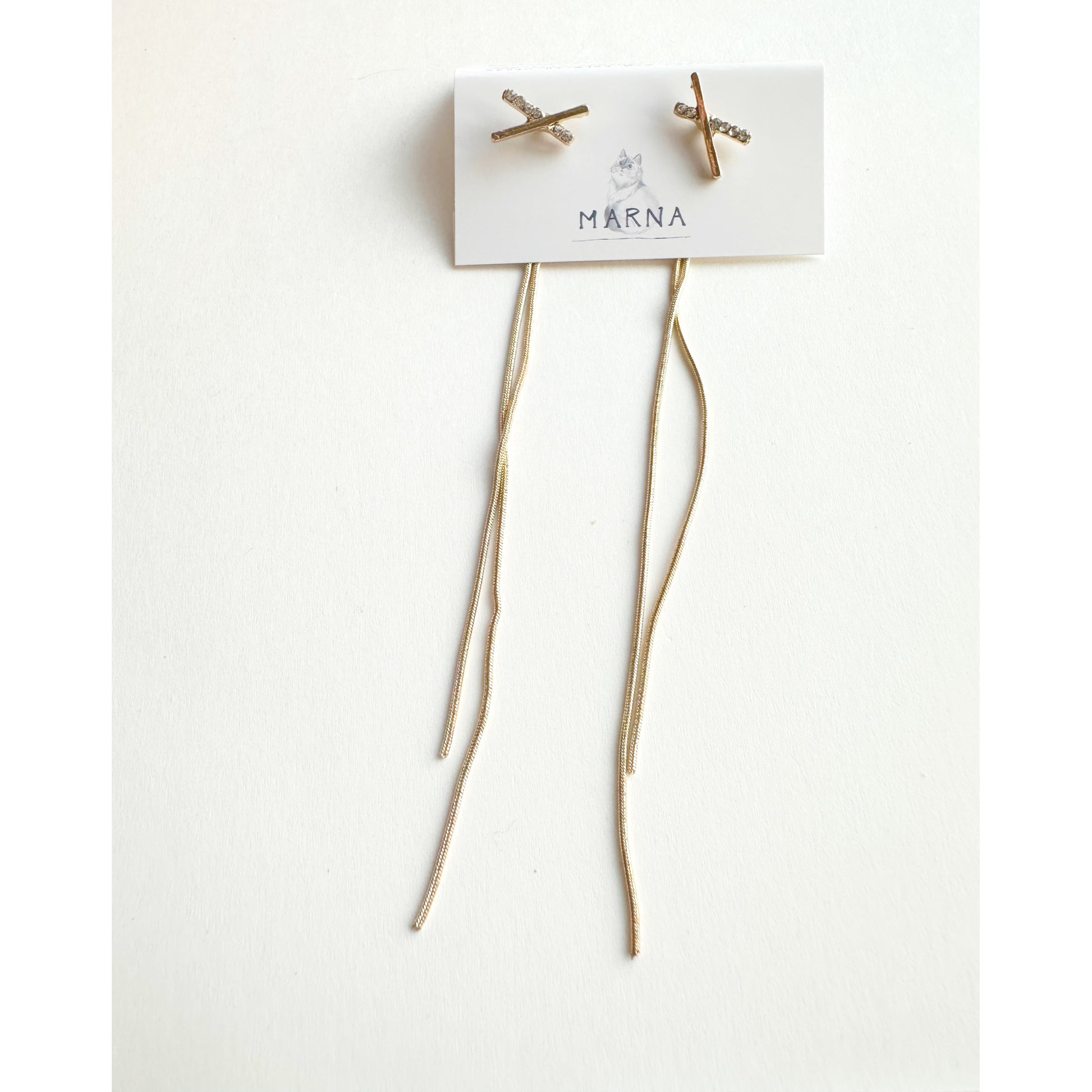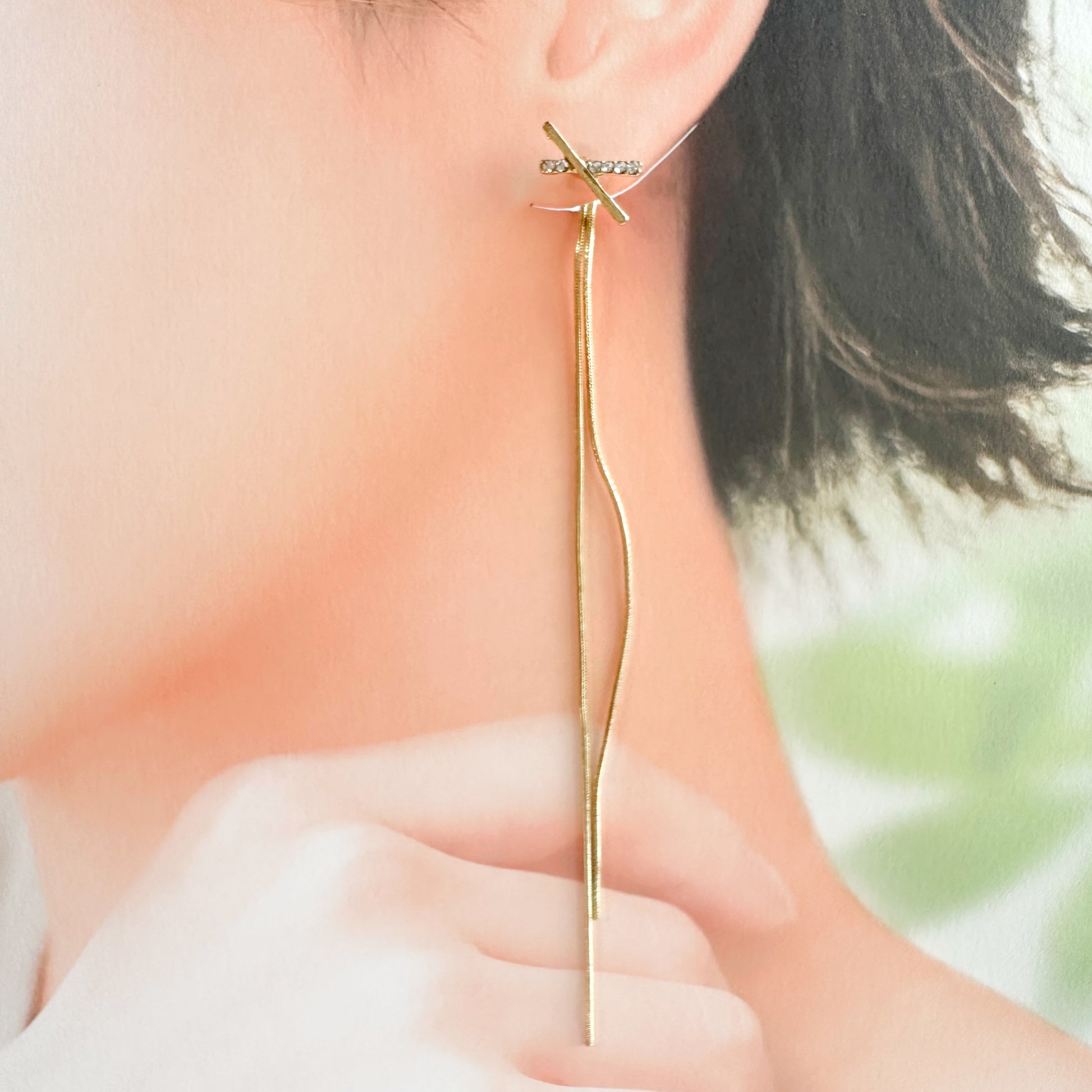 ビジューのついた小さなクロスに、長めのチェーンはキャッチ側についているため、耳の後ろから見えるます。人気のデザインです。